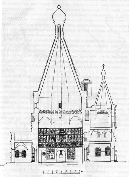 Профилировка закомар в Успенской церкви имеет более развитые и размельченные членения, чем соответствующие им спокойные и крупные профили Архангельского собора.