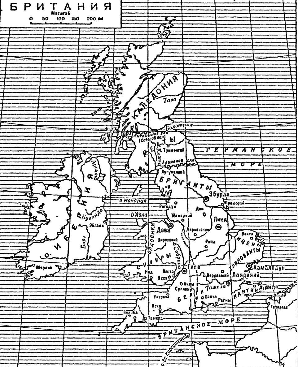 О судьбах острова в III в. нам почти ничего не известно. Серьезных столкновений здесь, по-видимому, не происходило, так как до Диоклетиана и его соправителей ни один император не имел победного прозвища «Британский»; и если на пространстве между валами Пия и Адриана римские порядки никогда не прививались прочно, Адрианов вал, по-видимому, все же и тогда выполнил свое назначение, и под его охраной чужеземная цивилизация получила возможность спокойного развития. В эпоху Диоклетиана мы находим территорию между обоими валами очищенной от враждебных племен, однако Адрианов вал по-прежнему остается занятым римлянами, а прочее их войско-расположено между этим валом и главной квартирой Эбураком в целях защиты римских владений от часто упоминаемых отныне набегов каледонян, или, как они теперь обычно называются, «татуированных» (рюб), и прибывающих из Ивернии скотов. Римляне имели в Британии постоянный флот; но так как морское дело всегда оставалось слабым местом римской обороны, то и британский флот имел некоторое значение лишь в течение недолгого времени при Агрнколе.