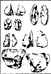 Самый нижний, восьмой древнейший слой — раннеашельский или даже олдувайский. Каменные орудия здесь находятся в базальном, лежащем уже на коренных породах галечнике. Это серия отщепов с широкими гладкими ударными площадками, плохо выраженные скребловидные орудия и галечные чопперы — гальки с несколькими сколами с одного края, образующими слегка выпуклое лезвие. Имеются орудия, обработанные с одной стороны,— унифасы. Есть и формы, отдаленно напоминающие рубила. Их В. Н. Гладилин предлагает называть проторубилами. Находок здесь пока еще мало, но они есть, и дальнейшее расширение раскопочных работ, конечно же, увеличит коллекцию и позволит охарактеризовать ее более полно. Выше встречены находки следующего, немногочисленного по находкам комплекса. Он относится к концу минусовой эпохи Матуяма и может быть, таким образом, датирован возрастом в 730—800 тыс. лет.