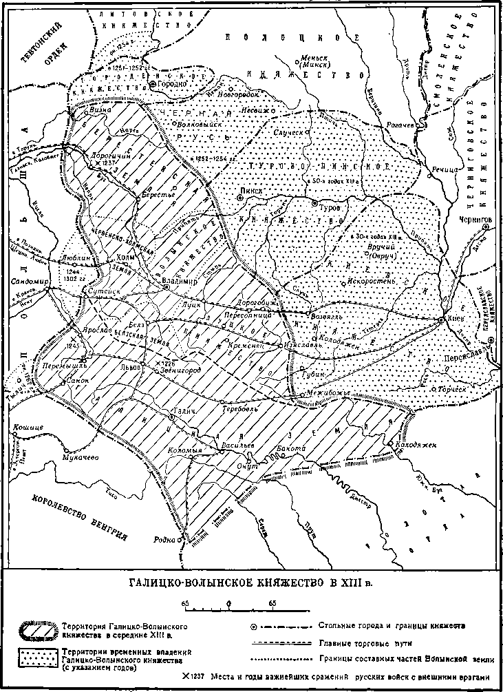 В 30-х годах XIII в. Мендовг объединил ранее разрозненные литовские племена в первое Литовское государство. Вначале он поддерживал Романовичей, опираясь на них в объединении Литвы. Когда Даниил во время войны с Ростиславом Михайловичем готовился к генеральной битве, Мендовг послал ему подмогу. Но в конце 40-х годов отношения Галицко-Волынского и Литовского княжеств обостряются. Между ними началась длительная война. В 1254 г. к Галицко-Волынскому княжеству была присоединена Черная Русь (вначале опа досталась сыну Даниила Роману). К тому времени Даниил завоевал почти всю Ятвяжскую землю. Это продвинуло галицко-волынские рубежи на северо-запад и поставило в зависимость от Даниила Турово-Пинскую землю, с двух сторон охваченную его новыми владениями.