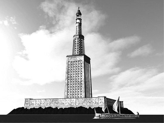 3D-модель Александрійського маяка. Стодесятиметровий маяк на острові Фарос був одним із Семи чудес античного світу. Мідне дзеркало, встановлене на маяку, відбивало вночі світло багаття, а вдень — світло сонця. Він справляв настільки сильне враження, що мореплавці почали називати Фаросом радше маяк, ніж сам острів, де його було збудовано. І дотепер у багатьох мовах Середземномор’я словом «фарос» (гр. pharos, іт. faro, фр. phare) позначають маяк або лампу. Модель Емада Віктора Шенуди базується на проведених у 2006 р. нових обчисленнях розмірів маяка. Човен на передньому плані слугує за основу для порівняння величини. Ілюстрація: Емад Віктор Шенуда