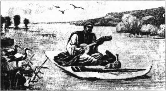 Характерник плывет по реке, подстелив войлок. Со старинной картины.