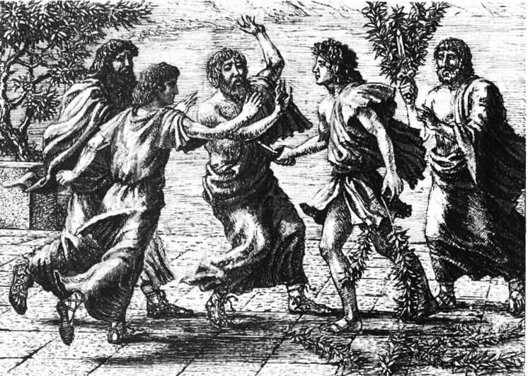 После угощения женихи завели разговор о музыке и танцах, продолжая осушать кубки с вином. В самый разгар веселья Гиппоклид приказал принести ему стол, а флейтисту велел играть веселый мотив. Ко всеобщему удивлению, он вскочил на принесенный стол и стал, кривляясь и заливаясь смехом, танцевать лаконские и аттические танцы. Не понравилось это Клисфену, а он уже было приготовился назвать Гиппоклида своим зятем. Но что делать? Пришлось ему сдержаться. Когда же Гиппоклид, встав на голову и высоко задрав ноги, принялся исполнять акробатические трюки, Клисфен не мог больше молчать и закричал: