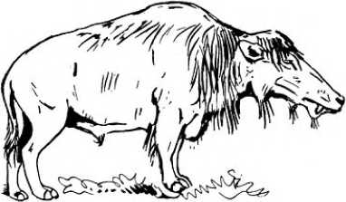 Не менее диковинным созданием был уинтотерий. Он был громаден и на голове нес шесть «рогов». Но рога эти были не настоящими, как у коровы, а всего-навсего представляли собой костяные выросты. Рога и острые кинжалоподобные верхние клыки придавали зверю страшный вид. Зверь этот был очень глуп. От поколения к поколению размеры его тела возрастали, тогда как мозг не увеличивался. Поэтому, возможно, весь род уинтотериев бесследно вымер в конце эоцена.