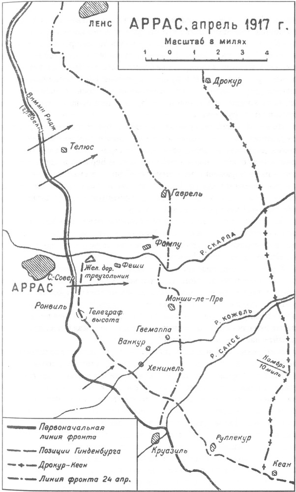 Но, предвидя такую попытку, германцы вырыли параллельную линию окопов от Кеана (у северного края «позиции Гинденбурга») мимо Дрокура, чтобы прикрыть тыл старых укреплений севернее Арраса. Таким образом все виды Алленби на стратегический успех всецело зависели от того, удастся ли ему достигнуть этой лишь частично доведенной до совершенства промежуточной позиции, лежащей в 5 милях за передовой линией обороны, и прорвать ее, прежде чем сюда подойдут в достаточном числе германские резервы.