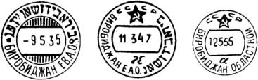 Почтовые штемпели Биробиджана как доказательство характерной эволюции: в 1935 г. надпись на идиш «Еврейская автономная область», на штемпеле 1947 г. в тексте на идиш исчезло сокращение «евр.», в штемпеле 1955 г. отсутствуют еврейские буквы, а в надписи, сделанной кириллицей, отсутствует упоминание Еврейской автономной области, хотя она продолжала формально существовать