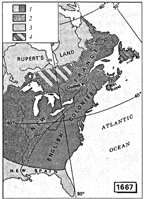 Карта 5. Колонии европейских держав в Северной Америке после договора в Бреда (1667). 1 — английские владения; 2 — французские владения; 3 — испанские владения; 4 — спорные территории.