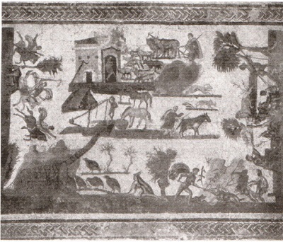 В центре картины — крестьянский дом или сарай; в воротах, опираясь на длинный посох, стоит человек, возможно пастух, и смотрит на приближающееся стадо. В боковой стене дома — три окна и низкая дверь, к двери прислонен плуг. К дому приближается стадо коз, овец и коров, а две собаки бегут по полям в противоположном направлении. Выше стада — человек, который пашет поле на быках. Рядом с домом — шатер («шурби») и примитивный колодец, из которого только что набрал воду другой человек, чтобы наполнить корыто и напоить лошадь. Вторая лошадь привязана к столбу между колодцем и домом. Справа человек в тяжелом плаще погоняет осла. Эта центральная часть мозаики безусловно представляет собой вид одной части большого поместья: скорее всего, это хлев или сарай, вряд ли перед нами дом одного из coloni. Вокруг центральной части мы с трех сторон видим сцены, которые показывают разнообразные занятия владельцев имения и их работников. Слева трое изящно одетых мужчин на роскошных конях нападают на львицу и поражают ее. Внизу — другие сцены охоты. Какой-то человек, обрядившись козой, медленно на четвереньках ползет среди скал, загоняя в сеть бегущих впереди него куропаток. Другой человек, в одном плаще, развевающемся у него за плечами, нападает в болоте на дикого вепря, а его спутник пытается удержать огромного бульдога, который рвется к вепрю. Справа от центральной картины мы видим сцены сельской жизни. Пастух в поле под оливой наигрывает на флейте; вокруг него — стадо коз; другой пастух доит козу. Справа — раб-негр, срывающий оливки с большого дерева.