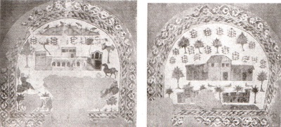 Из четырех мозаик, украшавших triclinium, здесь приведены две. На центральной мозаике, от которой сохранились только фрагменты, изображены сцены охоты в африканских степях. На центральном мозаичном поле изображен вид на жилую часть виллы, обрамленную роскошным парком и цветником (??????????), где порхают разнообразные дикие и ручные птицы (см.: Reinach S. Op. cit. Р. 391, 5; Rostovtzeff М. Op. cit. S. 125). Боковые мозаики, представленные в нашей таблице, иллюстрируют различные постройки в поместье. На мозаике слева — большой, вместительный хлев среди оливковых деревьев и виноградных лоз; на заднем плане — холм с куропатками, на переднем плане — пастушка, которая прядет, сидя под тополем, и пасет овец, находящихся между деревьями; рядом с хлевом стоит породистая лошадь. На мозаике справа изображен большой сарай и складские помещения, где, вероятно, хранили растительное масло и прессы для вина; и сарай и склады обрамлены зеленью олив и виноградных лоз; перед ними — птичий двор, на нем несколько деревьев и три помещения, вероятно курятники, а также пруд для рыбы, уток, гусей и т. д. Мозаики из Табраки представляют нам сложную картину жизни имения, где изготовляли вино и масло, разводили лошадей, скот и птицу, т. е. они показывают планомерно развивающееся крупное сельскохозяйственное производство. Ср. мозаику из имения Юлия на Табл. 62 и гл. XII. Эти поздние памятники приведены здесь в связи с тем, что тип африканской виллы, по всей вероятности, существенно не менялся на протяжении II–III/IV вв. н. э.