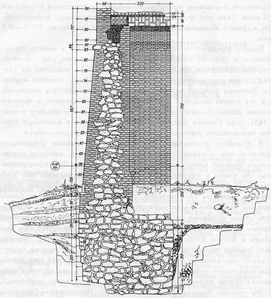 Правда, этот материал оказался непрочным и сильно разрушился в тех местах, куда попадало много воды. Анализом было установлено, что такой песчаник встречается на правом берегу Волги и особенно Оки, у пристани Береговые Новинки и выше у д. Чубалово Павловского района (по определению геолога В. И. Гореловой). Особый характер и красоту придавало сооружениям кремля соединение в них камня и кирпича — сочетание красного и белого цвета смягчало строгость крепостной архитектуры. В стенах у Коромысловой башни применены оба материала (рис. 46). На прясле, обращенном к Почаинскому оврагу, белокаменная облицовка идет от земли до полувала, выше которого стена и зубцы кирпичные. С внутренней стороны камень доходит до боевого хода, а из кирпича выложены арки и парапет. Верх башни облицован кирпичом, а ее нижние ярусы, со всеми внутренними помещениями, имеют белокаменные стены. Это отличает Коромыслову башню от других сооружений Нижегородского кремля, где прочным естественным камнем укреплены в основном только части, подверженные ударам, — углы квадратных башен, обрамления боевых окон, гнезда опорных брусьев, блоки для заделки подставов, а также перемычки небольших проемов и т. п. Однако наряду с каменной облицовкой поверхности многих стен были кирпичными с начала существования кремля. Такими были, по-видимому, все квадратные, да и большинство круглых башен. Так, нижние части древних стен Ивановской башни, освобожденные от контрфорсов XVI — начала XVII века, оказались кирпичными.