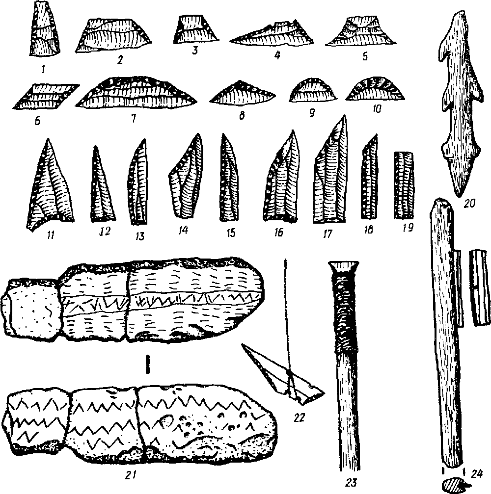 Орудия труда из мезолитических стоянок Украины: 7—19 — микролиты; 22–24 — способы их использования; 20 — костяной гарпун; 21 — «чуринга»