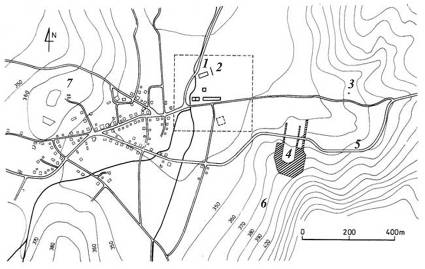 Немея, план святилища: 1. Храм Зевса, 2. Алтарь, 3. Источник, 4. Стадион, 5. Дорога в Клеонаи, 6. Город Немея ("Старые Немеи"), 7. Тсунгиза.