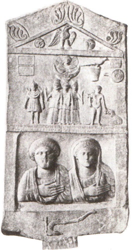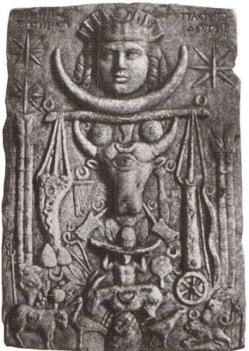 Надпись: ???? ?????? seat ??????????? [Месяцу Спасителю и Подателю богатств (греч.)] (sic). Стела является примечательным свидетельством популярности и быстрого распространения солярного пантеизма из Малой Азии и Сирии во II–III вв. по Р. X. В Малой Азии эти религиозные воззрения концентрируются вокруг бога Мена. Культ богов света был одновременно культом божеств, создавших культуру и благоденствие. Эта идея отражена как в надписи, так и в рельефах стелы (ср.: Ситом F. Le religions orientales. 1929. Р. 58, ср. 66). В верхней части стелы расположена маска Мена — Сола; она украшена короной из лучей (с солнцем и полумесяцем посредине) и опирается на большой полумесяц. Справа и слева — три звезды. В средней части стелы просматривается странная композиция. Мы видим предмет, напоминающий весы. Коромысло весов образует двуглавая змея (каждая ее голова увенчана полумесяцем), а на месте чаш с одной стороны расположен рог изобилия (cornucopiae) Фортуны, со змеей наверху, голова которой опять-таки увенчана полумесяцем, с другой же стороны — атрибуты Геркулеса (булава и лук). Весы опираются на огромную голову быка (символ Мена) с двумя полумесяцами, двумя солнечными дисками и рогом изобилия между рогами; во лбу у него — большой глаз, над ним — полумесяц. Справа и слева от головы быка мы видим предметы, принадлежащие к культу Мена, — арфу, свирель и два весла богини Фортуны (на этих и всех других предметах, изображенных на стеле, — полумесяцы). Ниже — атрибут Вулкана (щипцы) и атрибут Венеры (зеркало). Рог изобилия опирается на шапки Диоскуров, булава Геркулеса — на колесо Немезиды. Слева и справа от весов — по два факела; те, что слева, опираются на голову быка, те, что справа, — на голову козы (символы Деметры и элевсинских мистерий). В нижней части плиты — четыре знака Зодиака, символизирующие четыре времени года; в центре — Virgo [дева (лат.)] (осень), на подносе она держит листья и пирог с изображением полумесяца; под нею — Capricomus [козерог (лат.)] (зима); слева — Aries [овен (лат.)] (поздняя весна, май) на фоне колосьев и плодов; слева — Leo [лев (лат.)] (лето), позади него — змея, увенчанная полумесяцем. Позади Aries — caduceus Меркурия, ниже козерога — символы Аполлона (журавль и ворон).
