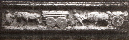 Две тяжелые повозки, в одну из которых впряжены мулы, в другую — быки, обе нагружены большими мешками. В другой части того же фриза изображен бой гладиаторов. Вуд предполагает, что оба фриза предназначались для украшения Магнезийских ворот Эфеса. Мне представляется более вероятной их принадлежность к надгробному памятнику вне ворот. Скульптуры должны были напоминать о боях гладиаторов, которые устраивал усопший (ср. аналогичные памятники в Италии, например надгробие Умбрикия Скавра в Помпеях: Маи A. Pompeii. Р. 438. Fig.258, а также надгробие Риети: Reinach S. Rep. d. rel. III. P. 334), и, возможно, об оказанных городу услугах в виде импорта зерна во время голода или ответственности за возложенные властями prosecutio аnnоnае (?????????; ср. гл. VIII и IX).