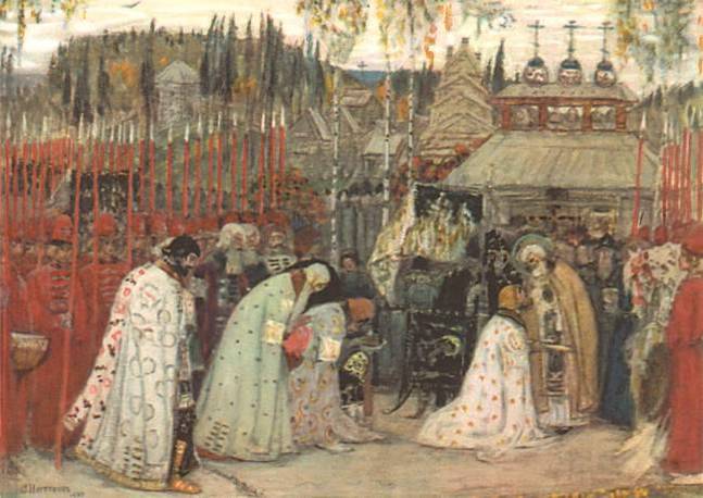 П. Корин. «Дмитрий Донской» Московский князь Дмитрий начал готовиться к решительной борьбе. Он известил всех русских князей о нависшей опасности и предложил им объединиться для отражения нашествия. Вскоре от Мамая, по обычаю, прибыли послы с требованием выразить ему покорность и заплатить дань. По совету духовенства и бояр Дмитрий богато одарил послов и отправил боярина Захария Тютчева в Орду с подарками Мамаю. Тютчев был опытным дипломатом, он разведал обстановку и передал Дмитрию, что к войску Мамая присоединились Ягайло и Олег.