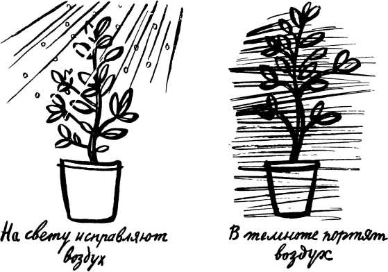 Итак, исправляют воздух, выделяя кислород, только зеленые части растения и только на свету. Во тьме и при скудном освещении все части растения — зеленые и незеленые — лишь портят воздух.