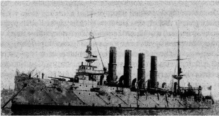 Рис. 1. Крейсер «Варяг» перед морским сражением под Чемульпхо (Инчхоном). 9 февраля 1904 г. японская эскадра в составе шести бронированных крейсеров и восьми миноносцев напала на крейсер «Варяг» и канонерскую лодку «Кореец», стоявшие в порту Чемульпхо (Инчхон) для выполнения задач по охране российской миссии в Сеуле. В результате неравного боя в открытом море перед Чемульпхо «Варяг» потерял 31 моряка убитыми и почти 200 — ранеными (экипаж всего состоял из 18 офицеров и 535 матросов), но отказался сдаваться на милость противника, затопив вместо этого корабль на рейде Чемульпхо («Кореец» был взорван — см. иллюстрацию далее). Героизм «Варяга» был высоко оценен даже противником — в 1907 г. японский император наградил командира крейсера В.Ф. Руднева орденом Восходящего Солнца (который тот принял, но никогда не носил). Боем под Чемульпхо началась русско-японская война, итоги которой стали роковыми для судеб корейской государственности.