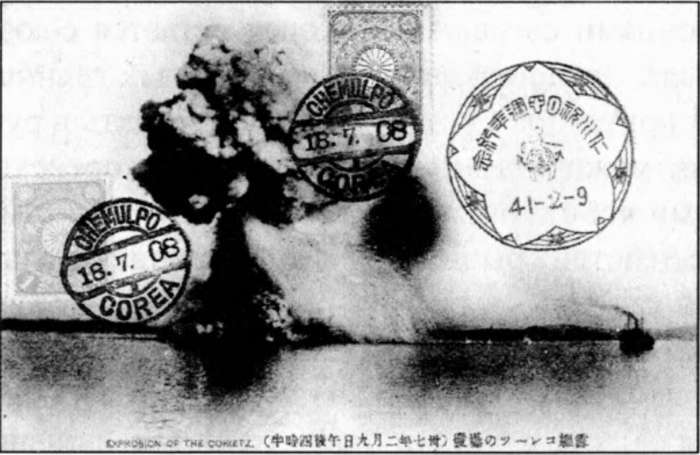 Рис. 2. Канонерская лодка «Кореец», взорванная командой для того, чтобы не отдать корабль в руки противника. (Японская почтовая открытка)