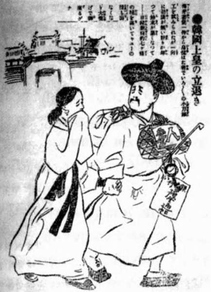 Рис. 13. Отречение Коджона. Японская карикатура 1907 г., изображающая теперь уже бывшего императора Кореи в виде бедняка, покидающего дворец с котомками через плечо и банковской чековой книжкой в руке.