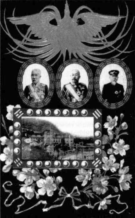 Рис. 18. Памятная открытка, выпущенная в Японии в связи с аннексией Кореи (1910). На ней изображены портреты первых трех японских генерал-резидентов в Корее и здание генерал-губернаторства в обрамлении цветущих ветвей.