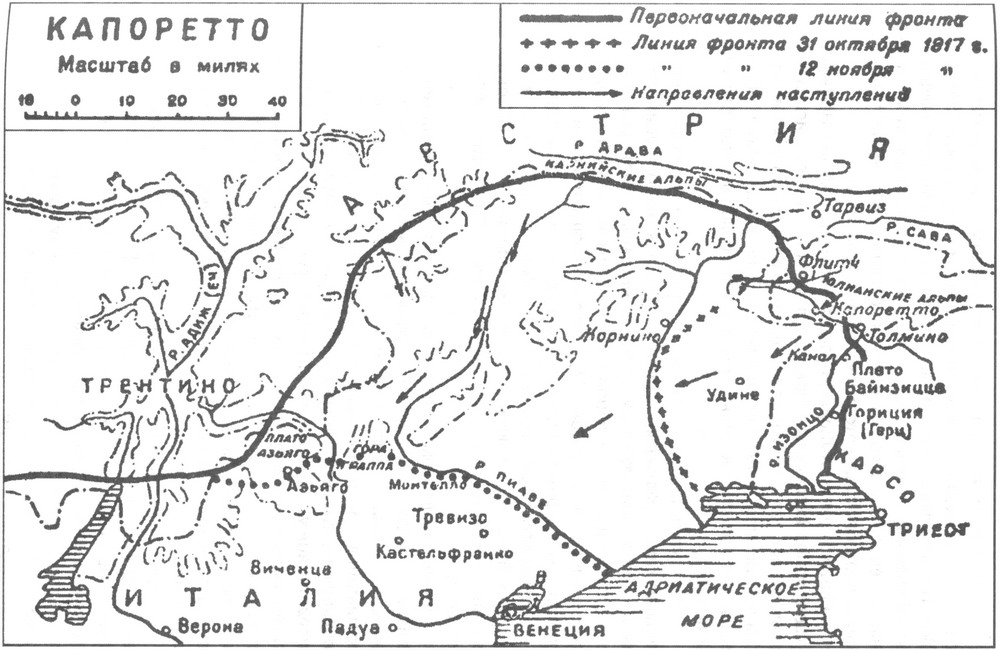 Меньше всего этого ожидали в Италии. Были бесспорные основания беспокоиться за Россию, но итальянцы вели атаки весь август и сентябрь, а по телеграммам создавалось впечатление, что бои развиваются явно в их пользу. На этот раз сведения о достижениях даже были верны, хотя обычно в военных донесениях преувеличений больше, чем достоверных фактов.