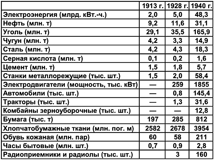 В чрезвычайных обстоятельствах конца 20-30-х годов в советской модели индустриализации акцент делался не на постепенном замещении импорта все более сложных промышленных изделий, а на развитии самых передовых в ту эпоху отраслей: энергетики, металлургии, химической промышленности, машиностроении, являющихся материальной основой формировавшегося современного военно-промышленного комплекса и одновременно «индустриализирующей промышленностью» — передаточным механизмом индустриальной технологии в другое секторы производственной деятельности. В условиях нехватки капиталов этот курс сопровождался сверхцентрализацией экономической жизни, централизованным перераспределением ресурсов в интересах приоритетных отраслей («административная система»). Так, в годы первой пятилетки из 1500 крупных предприятий-новостроек была выделена группа первоочередных. Эти 50–60 объектов обеспечивались всем необходимым. Их стоимость достигала почти половины общих вложений в промышленность. Но и среди ударных строек предпочтение получили наиважнейшие 14. Особое внимание каждой из них уделял Г. К. Орджоникидзе, возглавлявший ВСНХ СССР, а с 1932 г. — Наркомтяжпром. Данный путь позволил сравнительно с дореволюционным временем в 2–3 раза увеличить темпы роста приоритетных отраслей. За 13 лет развития России перед первой мировой войной (1900–1913) ежегодное производство чугуна и стали выросло менее чем в 2 раза (соответственно с 2,6 млн. т и 2,3 млн. т до 4,2 и 4,3 млн. т), производство угля — более чем в 2 раза (с 12 млн. т до 29 млн. т), производство нефти практически не изменилось (10,4 млн. т и 9,2 млн. т). За 12 лет советской индустриализации (1928–1940) годичное производство чугуна и стали увеличилось в 4–5 раз (примерно с 3 и 4 млн. т соответственно до 15 и 18 млн. т), угля почти в 5 раз (с 35 до 166 млн. т), нефти — почти в 3 раза (с 12 до 31 млн. т). За 6 лет (с 1929 по 1935 г.) СССР поднял выплавку чугуна с 4,3 до 12,5 млн. т. США понадобилось для этого 18 лет с 1881 по 1899 г.; Германии — 19 лет с 1888 по 1907 г. (см. таблицу).