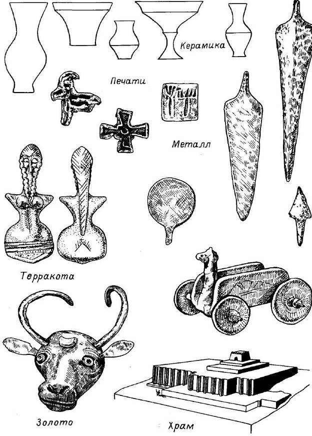Эти культурные и технологические новшества вплотную подводят к периоду средней бронзы, когда формируется весьма специфический археологический комплекс типа Намазга V, несущий все признаки урбанизированной культуры (рис. 38). Его характеризует наличие неорнаментированной тонкостенной керамики, обжигавшейся в двухъярусных горнах, выполненной на гончарном круге, отличавшейся изящными формами, среди которых можно отметить бокалы, вазы на высоких полых ножках и различные сосуды на высоких подставках-поддонах. Из металлических изделий типичны ножи с уплощенным лезвием и небольшим прямым черешком, булавки с фигурными навершиями, в том числе зооморфными, и печати, как геометрические, так и зооморфные. В мелкой пластике получают распространение уплощенные сидящие женские фигурки с лицом, обрамленным вьющимися косами-змеями, и со знаками, нанесенными на тулово. Территориально эта культура концентрируется на прикопетдагской равнине, обжитой еще первыми земледельцами, на заключительных этапах периода начинается широкое освоение мургабской дельты, где формируется целый оазис с центром на поселении Келлели (Масимов, 1979).