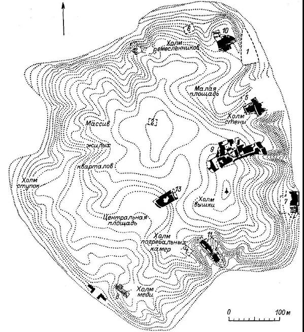 Рис. 39. Алтын-депе. План поселения. Цифры — номера раскопов.