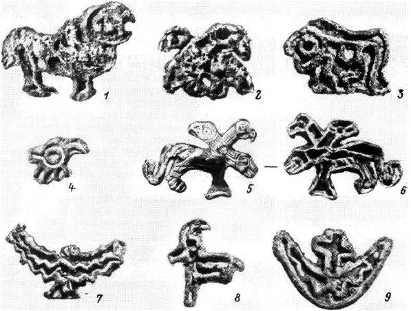 Особую группу металлических изделий составляют печати из бронзы или низкокачественного серебра, отливавшиеся в форме по способу утраченной модели (рис. 40). Наиболее многочисленны печати геометрической формы — в виде креста, пирамидки, квадрата или овала. В центре печатей, как правило, помещены дополнительные детали, придающие оттискам значительное разнообразие. Зооморфные печати воспроизводят козлов и других копытных животных, кошачьих хищников, орлов, имеются и синкретические образы, как например фантастический трехглавый дракон с туловищем кошачьего хищника, одной головой хищной птицы и двумя — рептилий, возможно змей. Несколько печатей имеют очертания в виде полумесяца, внутри которого помещено изображение извивающейся змеи.