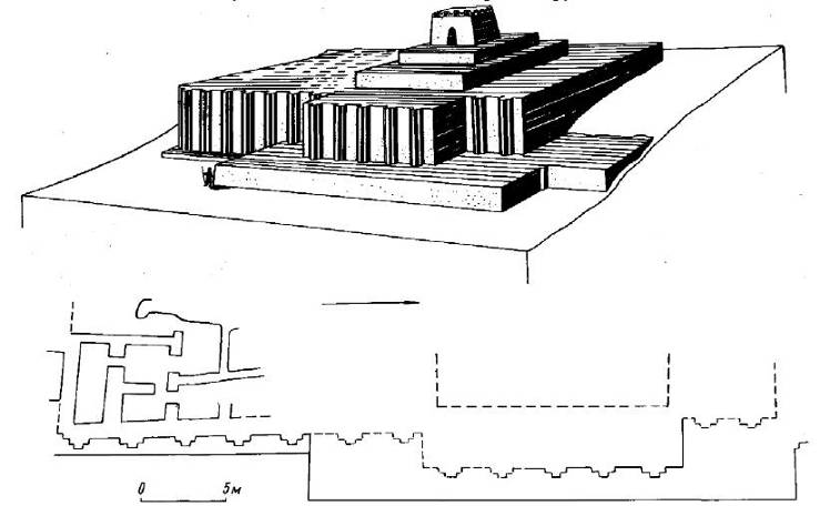 Существенным показателем уровня культурного развития было развитие монументальной архитектуры. По существу уже оформление главного въезда массивными башнями-пилонами принадлежит к числу явлений подобного рода. Более примечательным было создание специального культового центра, для которого использовали оплывший холм поры ранней бронзы, расположенный на восточной окраине Алтын-депе (рис. 42). Здесь уже на первом этапе существования комплекса были возведены крупный жилой комплекс («дом жреца»), гробница, созданы различные хозяйственные строения, устроены два больших двора — один с кирпичной вымосткой (предположительно двор собраний) и другой с очагами, где, возможно, совершались культовые жертвоприношения. Архитектурную доминанту комплекса образовывала трехступенчатая башня, имевшая по фасаду длину около 21 м и 8—10 м в вызамурованным в недрах сырцовых массивов. Рядом из сырцового кирпича была сооружена платформа 3-метровой высоты, на которой располагалось крупное хранилище. В целом парадный восточный фасад всего комплекса достигал в длину 55 ми был декорирован трехступенчатыми в плане пилястрами. Как сама идея ступенчатого башнеобразного сооружения, так и использование пилястр, членящих вертикальную гладь сырцовых стен, принадлежат к числу месопотамских архитектурных решений, сформировавшихся в Южном Двуречье еще в конце IV тыс. до н. э. и ярко представленных в памятниках всего III тыс. до н. э.