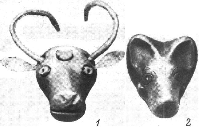 Рис. 43. Алтын-депе. Голова быка (1) и волка (2). Золото.