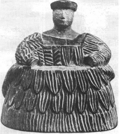 Характерным признаком рассматриваемого археологического комплекса являются глиняные статуэтки, среди которых первое место как по количеству, так и по яркости передаваемого образа занимают терракотовые фигурки женщин. Эти терракоты в подавляющем большинстве представляют собой плоские фигурки, изображающие сидящую женщину с расставленными в стороны руками. В единичных случаях концы рук слегка загнуты, свидетельствуя о том, что генетически этот тип восходит к терракотам эпохи энеолита с руками, опущенными вниз. Но, судя по всему, данный образ был забыт в бронзовом веке и заменен фигурками с призывным «жестом объятия» . Наиболее тщательно отделывалась верхняя часть скульптуры. Голова с преувеличенно большими ромбовидными глазами на длинной шее в первую очередь приковывает внимание зрителей. Лицо обрамлено двумя вьющимися косами-змеями, нередко толстая налепная коса спускается и на спину. На некоторых особенно тщательно выполненных экземплярах по обе стороны головы на уровне глаз отчетливо видны небольшие головки змей, которые, как бы стоя на хвосте, окружают шею и голову. К числу тщательно проработанных деталей относятся головные уборы разных видов и охватывающие шею ожерелья. Туловище статуэток обычно лишено налепных или процарапанных деталей и тем самым оттеняет перегруженную деталями верхнюю часть фигурки. В нижней части тулова помещен треугольник, символизирующий женское начало, а выше иногда воспроизводилось дерево. На многих статуэтках поверх треугольника идут процарапанные поперечные линии, изображающие набедренные повязки или пояса (рис. 41).