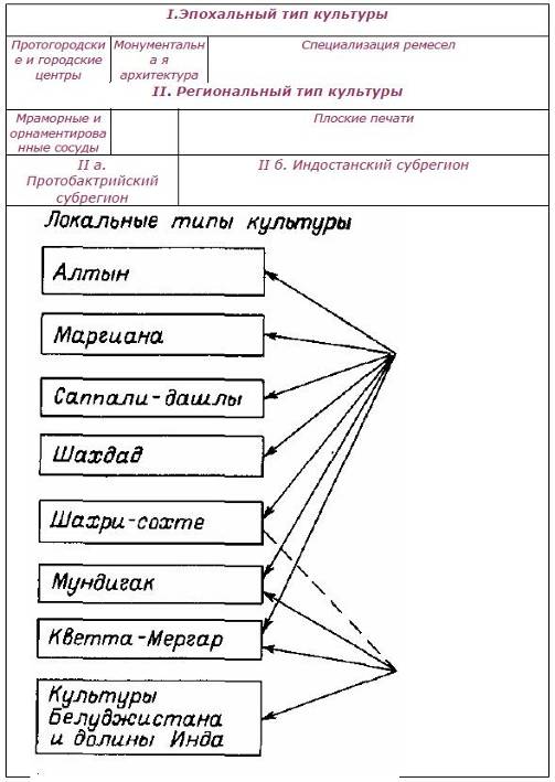 Культурная эволюция оседлоземледельческих общин, завершившаяся формированием протогородской цивилизации Алтын-депе, является примером сравнительно хорошо изученного процесса, документированного материалами археологии. Вместе с тем это был лишь частный случай более масштабных процессов, охвативших со второй половины III тыс. до н. э. не только юг Средней Азии, но и целый ряд соседних областей. Археологические комплексы Маргианы, Бактрии, Шахдада в Центральном Иране, Мергара на северо-западе Белуджистана характеризуют целый блок культур, который мы предлагаем именовать протобактрийским. Анализ художественных изделий, сочетающих глубинные, почти ранне-шумерские традиции и новые, специфические местные инновации, рисует культуры этого блока и Бактрию в первую очередь как выдающийся очаг искусства древневосточного мира (Amiet, 1986). Здесь ярко проступает соотношение различных типов культур (рис. 45). На эпохальном срезе это тип культуры, характерный для эпохи первых цивилизаций, хотя и в ее начальных, формативных проявлениях. На региональном уровне весь этот массив явно входит в культурную макросистему Древнего Востока, но имеет ряд специфических черт, позволяющих говорить об особом протобактрийском субрегионе. В наборах типов артефактов заметны существенные отличия от комплексов типа Шахри-Сохте и особенно Мергара IV—VII. В последнем сохраняет значение расписная посуда в керамическом комплексе, что указывает на близость к хараппскому пути культурогенеза. Однако вскоре подвижность границ культурных регионов приводит к определенной смене ситуации, и нерасписная посуда Мергара VIII и Сибри (Jarrige, 1985) явно принадлежит к тому же кругу явлений, что и керамические комплексы Маргианы и Бактрии. Специфическими чертами субрегиона являются изготовление каменных сосудов из мраморовидных пород и плоские, преимущественно металлические печати с ушком-петелькой на тыльной стороне. Ко II тыс. до н. э. усиливаются в субрегионе процессы культурной интеграции. Помимо керамики культурная общность проявляется в глиптике, торевтике, металлургии. Налицо ряд типов изделий, общих на субрегиональном уровне.