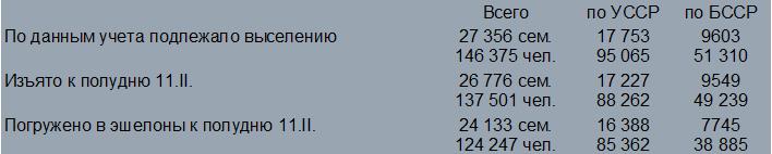Сообщаю предварительные данные о результатах проводимой НКВД СССР операции по выселению из западных областей Украинской ССР и Белорусской ССР осадников и лесной стражи.