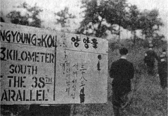 Рис. 1. Указательный щит на 38-й параллели, на разделительной линии между советской и американской войсками. 1945 г.