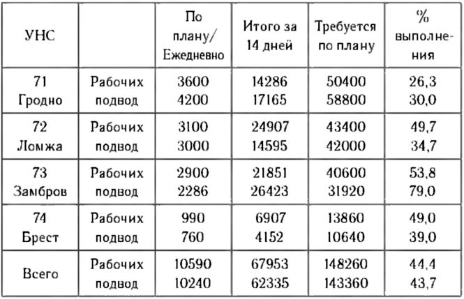 Этот документ наделял советские и партийные органы союзных республик и областей правом определять размеры платной трудовой и гужевой повинности населения и фактически оформил и закрепил то, что на местах уже было сделано. Постановление от 24 марта 1941 г. стало основой работы республиканских и областных органов власти по обеспечению военных объектов рабочей силой перед войной. Сводки о количестве посланных людей и подвод регулярно поступали командованию УНС, а также в обкомы и облисполкомы. Эта информация свидетельствовала о том, что практически каждый день на спецстроительство выходило рабочей силы меньше, чем требовалось (таблица). Как показали дальнейшие события, из-за огромного объема работ промышленность не успевала в намеченные сроки обеспечить всем необходимым строительство УРов. Создание новых укрепленных районов в округах было в «полном провале из-за отсутствия материалов, транспорта и механизмов»[416]. Несмотря на ужесточение мер по привлечению населения и направление воинских частей на спецстроительство планы хронически не выполнялись, и к началу войны строительство даже первой полосы УРов не было закончено.