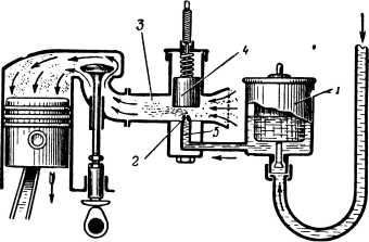 На рис. 65 дана схема простейшего карбюратора, патрубок которого соединяется с впускным патрубком цилиндра.