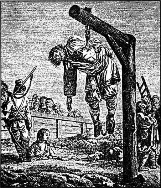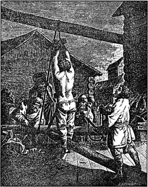 В ожидании ответов мужика подымают на дыбу: руки хрустят, вывертываются из суставов; кнут, по пословице: «Кнут не архангел, души не вынет», подновляет зажившие раны.