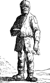 Шагах в пятидесяти от церкви стоял мужчина громадного роста в старом зеленом кафтане, с небольшими красными отворотами, поверх которых была надета кожаная портупея; на ногах у него были зеленые чулки и старые изношенные башмаки, в одной руке палка, в другой — старая, поношенная шляпа. Гигант этот был полковник гвардии, царь Петр Алексеевич, в том самом костюме, в котором разгромил Карла XII на полях Полтавы.
