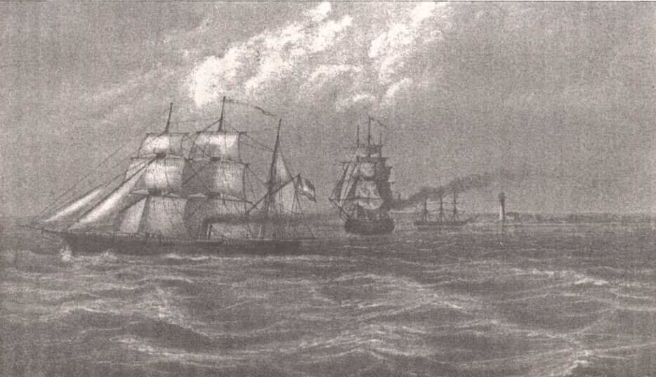 Срочно разведя пары «Сэмтер» направляется в море. До выхода из реки оставалось еще более шести миль, когда северяне заметили движение «Сэмтера». Прекратив свое преследование, они полным ходом направились назад к бару в самом устье реки. Замысел «Бруклина» был очевиден: перехватить корабль южан прежде, чем тот успеет пройти бар. Узкий проход через бар, удаленный от каждого из противников на расстояние шесть миль, и стал целью гонки. «Сэмтер» имел преимущество благодаря течению, но «Бруклин» обладал большей скоростью. Кроме того, он имел более тяжелые орудия, стрелявшие на большую дальность. Расстояние между противниками быстро сокращалось. Наконец «Сэмтер» проходит бар. Семс кладет руль право на борт и, огибая восточную банку, выходит из реки. В этот момент «Бруклин» производит выстрел из орудия, но ядро не долетает. Гонка усиливается. На какое-то время налетевший шквал скрывает «Бруклин» из виду, но когда погода проясняется, противник снова виден за кормой. Под парусами и парами он явно догоняет свою добычу. Тогда Семс ворочает на два румба на ветер и держит так круто к ветру, что противник не может нести паруса. «Бруклин» начинает отставать. Однако и у «Сэмтера» не все ладно, он попадает в соленую воду, котлы засаливаются и временно приходится уменьшать скорость. «Бруклин» снова получает преимущество, расстояние начинает сокращаться. «Впрочем, вскоре котлы удалось прочистить. Пар подняли до крайних пределов, винт делал по 65 оборотов в минуту». Расстояние снова начинает увеличиваться. Ровно через 4 ч после прохода бара погодя прекращается. «Бруклин» поворачивает назад. На «Сэмтере» раздаются громкие возгласы.