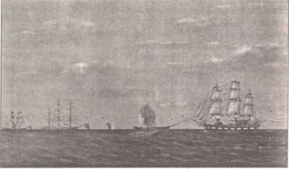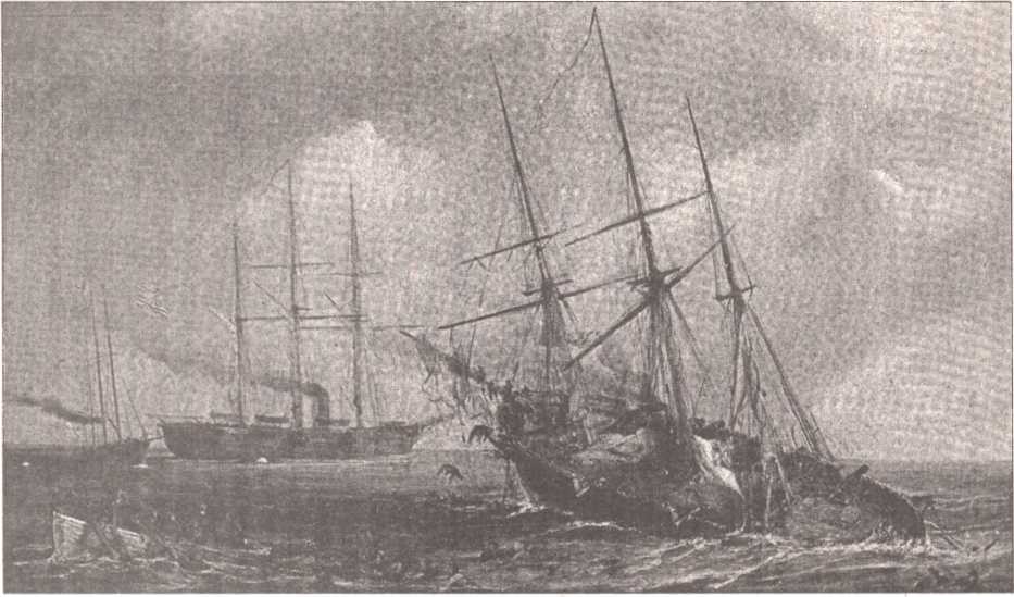Рейдер южан «Шинандоа» сжигает китобойные суда северян. Их экипажи отправлены домой на одном из судов