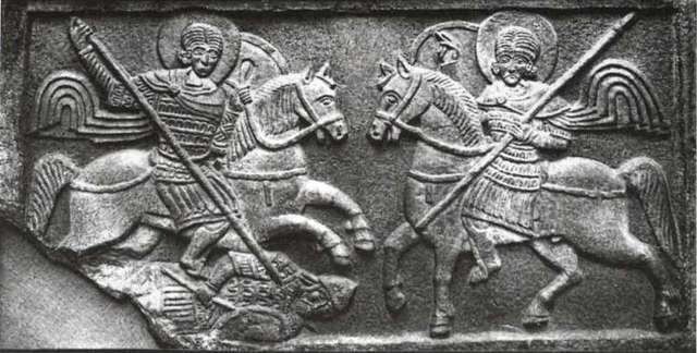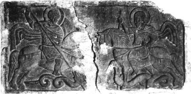 Винятковий інтерес становлять чотири шиферні плити з тематичними рельєфами: дві — із Михайлівського Золотоверхого монастиря і дві — з Києво-Печерського. На михайлівських плитах зображені вершники — “святі воїни”, покровителі київських князів: Георгій Побідоносець і Федір Стратилат — на одній, святий Меркурій і Дмитрій Солунський — на іншій. Рельєфи виконані з великою майстерністю. Зображення вершників водночас декоративні і динамічні.