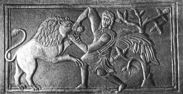 На плитах, знайдених у Печерському монастирі, передані популярні на Русі античні сюжети. На одній із них зображено Геракла в двоборстві з левом, на іншій — Діоніса, що їде в колісниці, запряженій двома левами.