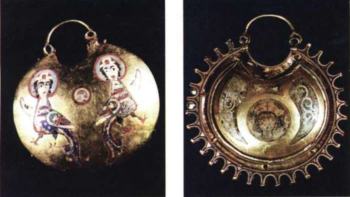 Особливістю давньоруського прикладного мистецтва було співіснування елементів язичницької і християнської символіки. Нерідко вони мирно уживалися на одному предметі. Так, на київській золотій емалевій діадемі XI — XII ст. з деісусним чином поряд з апостолами зображені дівочі голівки і “дерево життя”. Можна думати, що язичницькі сюжети і символи на виробах прикладного мистецтва X — XIII ст. несли в собі не тільки декоративну, а й магічну охоронну функцію. Орнаментальні композиції із “дерева життя”, птахів-сиринів (віл-русалок), жіночих голівок у кокошниках, рогів тура особливо характерні для емалевих колтів XII — XIII ст. Як складова частина весільного убрання вони своєю орнаментикою відображали насамперед ідею родючості. Найпоширенішим декоративним елементом на срібних колтах були “дерево життя” і крилате чудисько з пташиною або собачою головою, двома лапами і крилами. В ньому не без підстав вбачається уособлення слов’янського бога Симаргла, який був покровителем людини, охороняв посіви і рослинність.