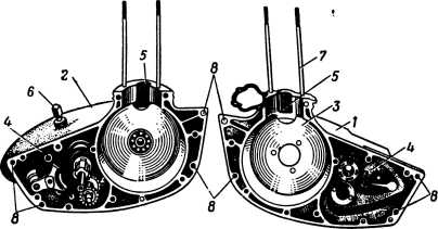 Рис. 37. Картер двигателя мотоцикла M1А: 1 — правая половина картера; 2 — левая половина картера; 3 — отсек коленчатого вала; 4 — отсек коробки передач; 5 — продувочные окна; 6 — пробка с контрольным стержнем для проверки уровня масла; 7 — шпилька для крепления цилиндра; 8 — отверстия для болтов крепления двигателя на раме.