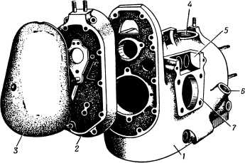 Рис. 38. Картер двигателя мотоцикла М-72: 1 — картер; 2 — крышка распределительных шестерен; 3 — передняя крышка; 4 — отверстие для шестерни привода масляного насоса; 5 — клапанная коробка; 6 — маслоналивная горловина; 7 — площадка для фланца цилиндра.