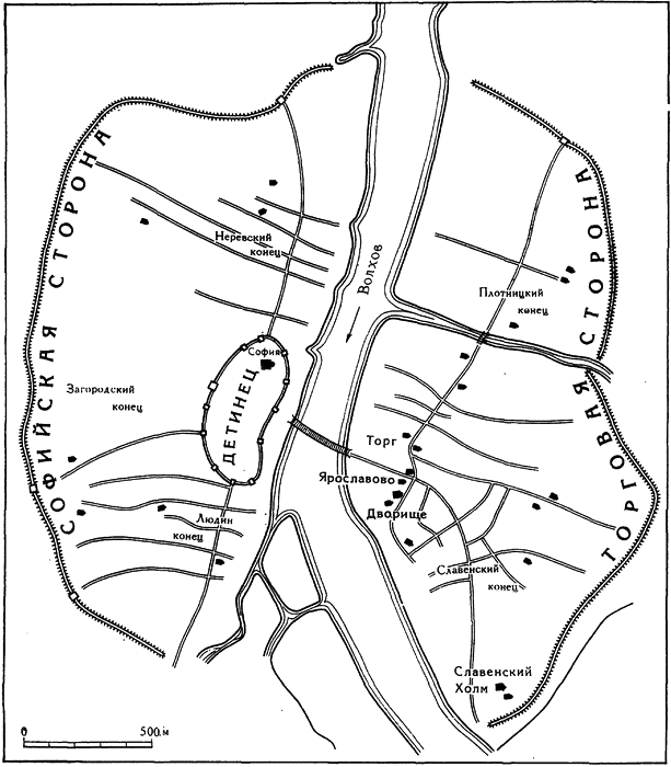 Напротив Кремля находились торг, вечевая площадь, Ярославово дворище, дворы иноземных купцов и церкви купеческих корпораций (Иван на Опоках, Богородица на Торгу, Варяжская божница). Берега Волхова были поделены на пристани и густо уставлены кораблями и лодками разных стран и городов. Судов на воде было так много, что иногда во время пожара огонь по ним переходил с одного берега на другой. По периферии города располагались монастыри. Юрьевский монастырь, построенный Мстиславом, возвышался, как башня, при въезде в город с юга, со стороны Ильменя, а для плывших с севера такими воротами города являлся Антониев монастырь. Город был вымощен деревянными мостовыми, относительно которых существовал даже специальный Устав о замощении улиц.