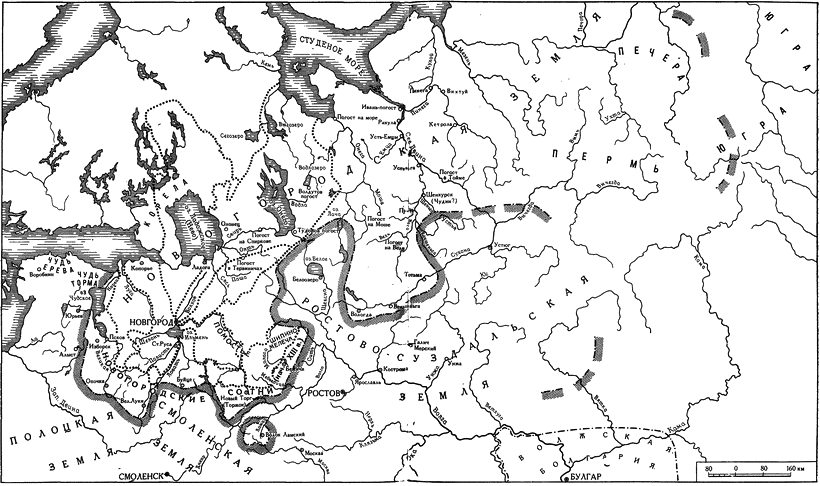 Вот именно здесь, на пограничье двух ландшафтных областей, где на протяжении сотен километров пришли в соприкосновение славянские и угро-финские племена, предки эстонцев, карелов, вепсов, коми, удмуртов, и возникла цепь древних городков, окаймлявших самые северные земли, до которых добрались в эпоху родоплеменного строя славяне. Таковы Псков и Изборск близ Чудского озера, Новгород на Ильмене, Белоозеро, Ростов. Одни из них возникли еще в догосударственную пору и были центрами тех или иных племенных союзов, другие же были поставлены как «новые города», как северные фактории Киевской Руси. Вероятно, к их числу и относился Новгород, возникший в IX в. Сложение государственности на юге изменило судьбу этих порубежных городов. Русские дружинники перешагнули в IX–X вв. границу двух ландшафтных зон, удерживавшую пахарей, и углубились в тайгу, открывая неведомые земли, встречаясь с различными народами и привозя в Киев вещи, изготовленные кузнецами Урала.