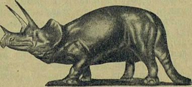 На странице 137 вы видите одного из таких ящеров — трицератопса: он назван так потому, что у него были три рога: два длинных, почти в метр, толстых у основания и острых в конце, рога над глазами; эти рога, направленные прямо вперед, служили трицератопсу страшным оружием; третий, маленький рог приподнимался на носу; этот рог служил, верно, украшением.