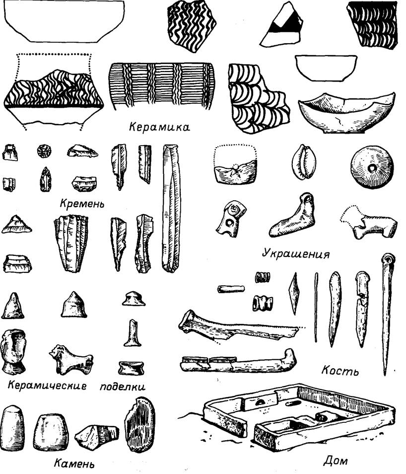 В сфере приготовления пищи налицо богатый арсенал различных орудий и предметов, облегчающих обработку, приготовление и прием пищи, основанной на использовании растительных продуктов. Возникает специальная отрасль, направленная на обслуживание этой сферы, — керамическое производство. Его разнообразная продукция указывает на то, что наряду с удовлетворением утилитарных потребностей здесь преследовались цели эстетического характера. Все возрастающее разнообразие форм сосудов свидетельствует о наличии целой системы приготовления, хранения и потребления пищи. Появляются ложки, вытачивавшиеся из кости и, видимо, из дерева. В меньшей мере представлены в археологических материалах данные о характере одеяний. Не подлежит сомнению лишь тот факт, что с развитием земледельческо-скотоводческой экономики широко используются разные ткани, на что указывает большое распространение пряслиц. Как и в сфере питания, здесь наблюдается отход от грубого утилитаризма: в раннеземледельческих поселках весьма многочисленны различного рода украшения, в том числе бусы, которые зачастую нашивались на одежду и образовывали нарядные узоры. На обеспечение этих потребностей были направлены специализированные производства. Таким образом, в культуре жизнеобеспечения раннеземледельческой эпохи отчетливо выражена тенденция к реализации благ, создаваемых в условиях экономики нового типа, к удовлетворению жизненных потребностей все более расширяющегося спектра.